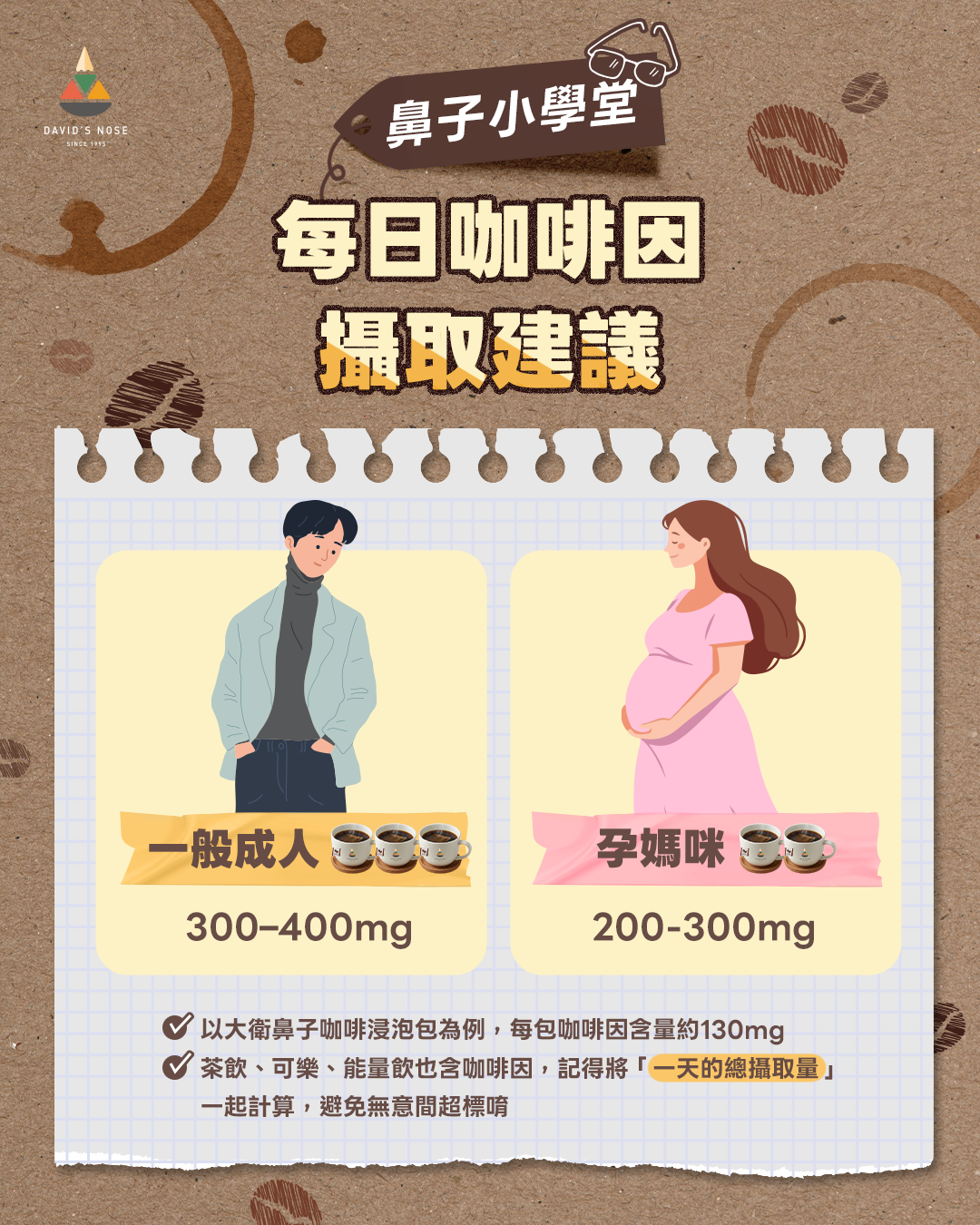 一般成人每日建議不超過 300–400mg,避免心悸、焦躁或影響睡眠,以 大衛鼻子咖啡浸泡包 為例,每包咖啡因含量約 130mg,一天可享用約2-3杯