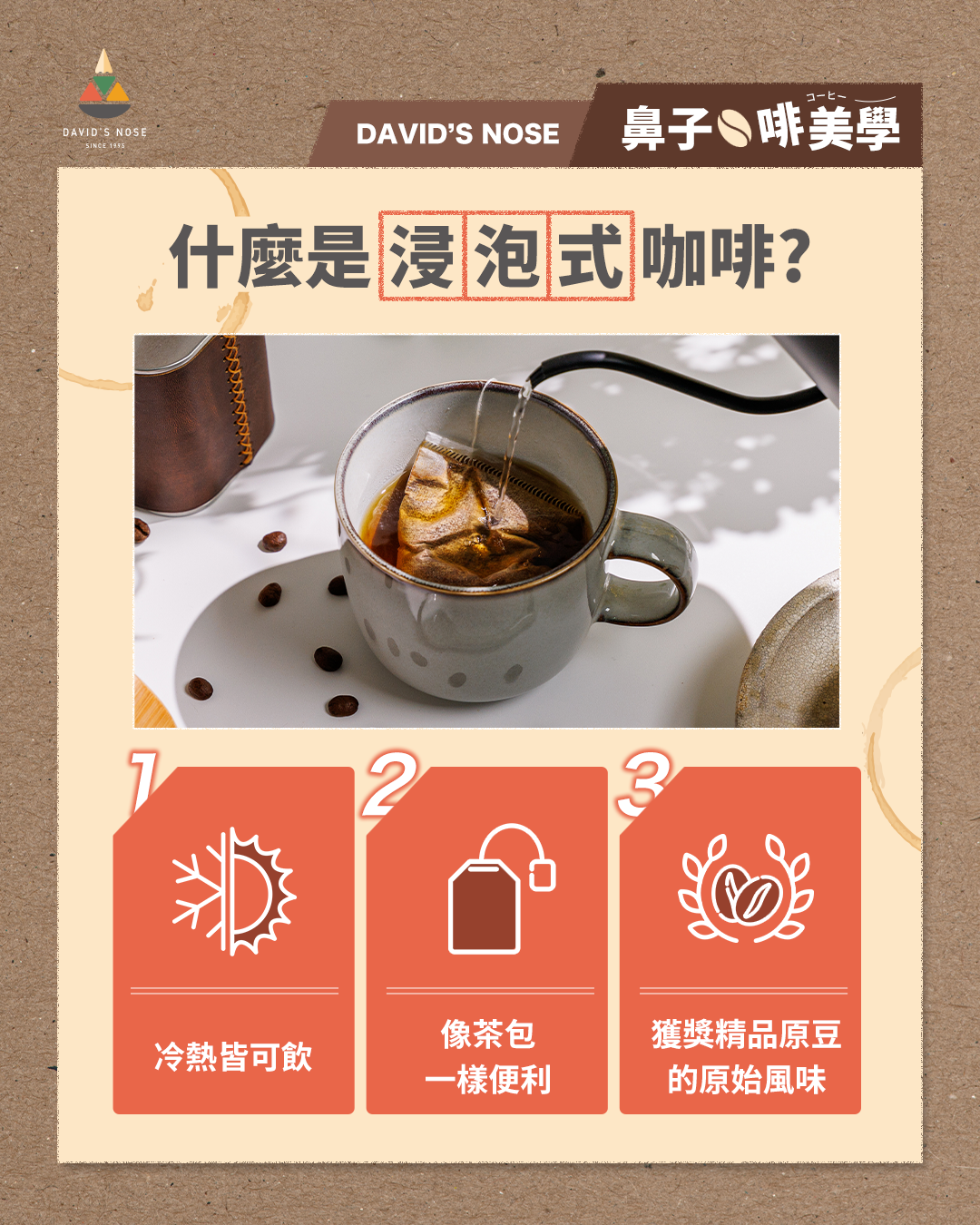 大衛鼻子咖啡的浸泡式咖啡,是將精品咖啡豆研磨後,直接封裝於濾泡包中,像泡茶一樣就能輕鬆沖泡。不同於即溶咖啡,這款產品保留的是原豆的真實香氣與風味層次,冷泡、熱沖、加奶都沒問題!